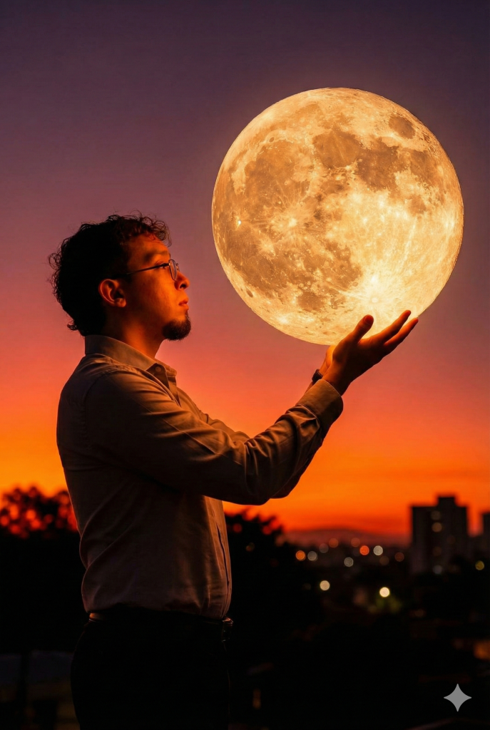 Cinematic photorealistic portrait, vertical composition, saturated and vivid colors. A man (use the provided image for accurate facial features) stands outdoors at sunset, waist up, in the right third of the frame, in profile facing left. He holds a giant, bright full moon in both hands, palms supporting its lower part, fingers spread. The moon is large, occupying the upper left quadrant, glowing intensely in a golden orange (#FF9E00 – #FFB84D), with visible craters and texture, radiating strong light. The man wears a light grayish-beige dress shirt. His skin and face are illuminated by a warm, deep orange light from the bright moon. Background: dramatic, saturated twilight sky, deep fiery orange (#FF4500) and intense crimson red (#D9381E) near the horizon, merging upward into a dark purple-violet (#4B2E83). Low: Dark clouds, visible horizon, silhouettes of trees and buildings in pure black (#000000), with some small, bright bokeh lights.