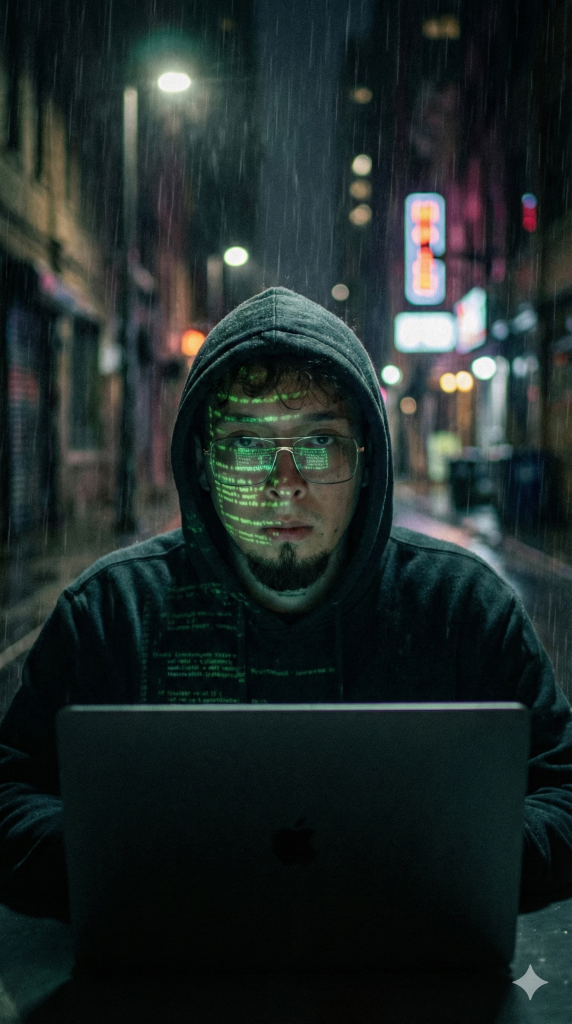 A portrait using my face, depicted as a hacker in a dark, rainy urban environment, strongly in the style of Mr. Robot. The subject is wearing a large hooded sweatshirt, covering the entire head but leaving the face visible, looking at the camera, with a computer screen reflecting a soft green code onto their face. The lighting is dramatic and low-contrast, with only the monitor light and some blurred streetlights in the background. There is a sense of isolation and paranoia. The image has a grainy, almost cinematic aesthetic, reminiscent of modern noir films, with a focus on technology and surveillance.