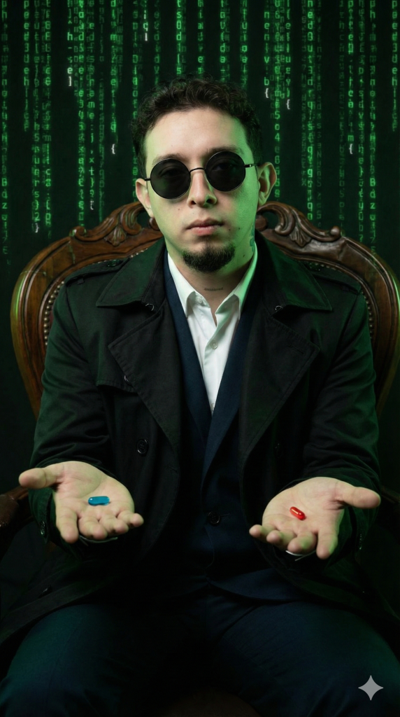 Can you convert this man to be seated in a grand, ornate armchair, dark in color. He’s dressed in a dark trench coat, a crisp suit, and using distinctive round sunglasses, which add to an enigmatic aura. The postureshould be composed and intentional, with his hands extended to offer a red and a blue pill.