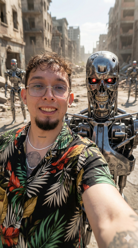 Create an ultra-realistic 3D selfie in 9:16 vertical aspect ratio from the attached photo of the man (use the provided image for accurate facial features) with a T-800-style robot. The photo should look like a typical iPhone selfie—slightly uneven framing, camera angle of view, slight distortion from the front camera, natural skin texture, daylight in the background, an apocalyptic scene with other T-800-style robots, subtle motion blur from hand movements, and authentic depth of field from the iPhone’s front camera. Maintain a high level of realism and detail, but with the casual, unpolished look of a real phone photo rather than a professional DSLR. 9:16 aspect ratio